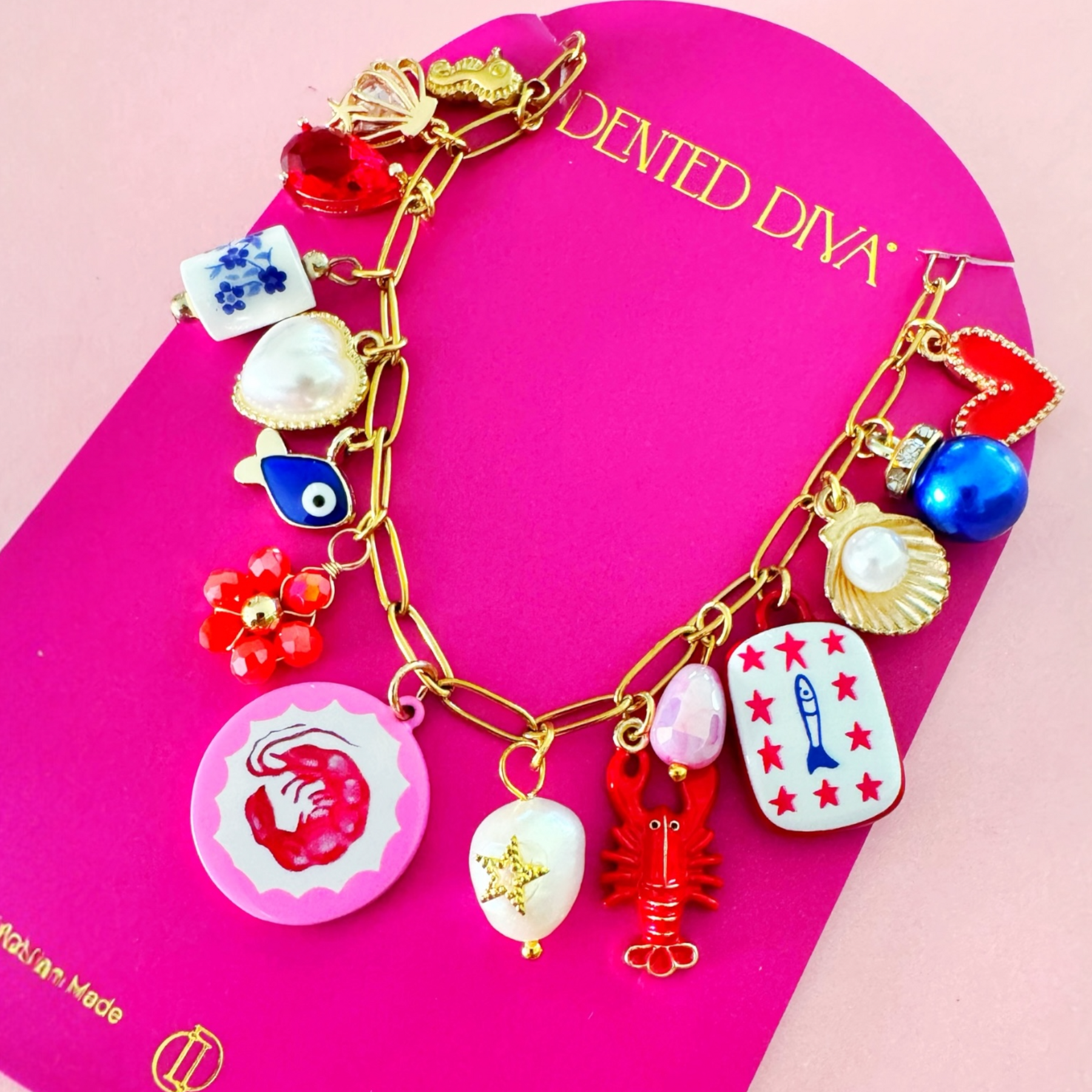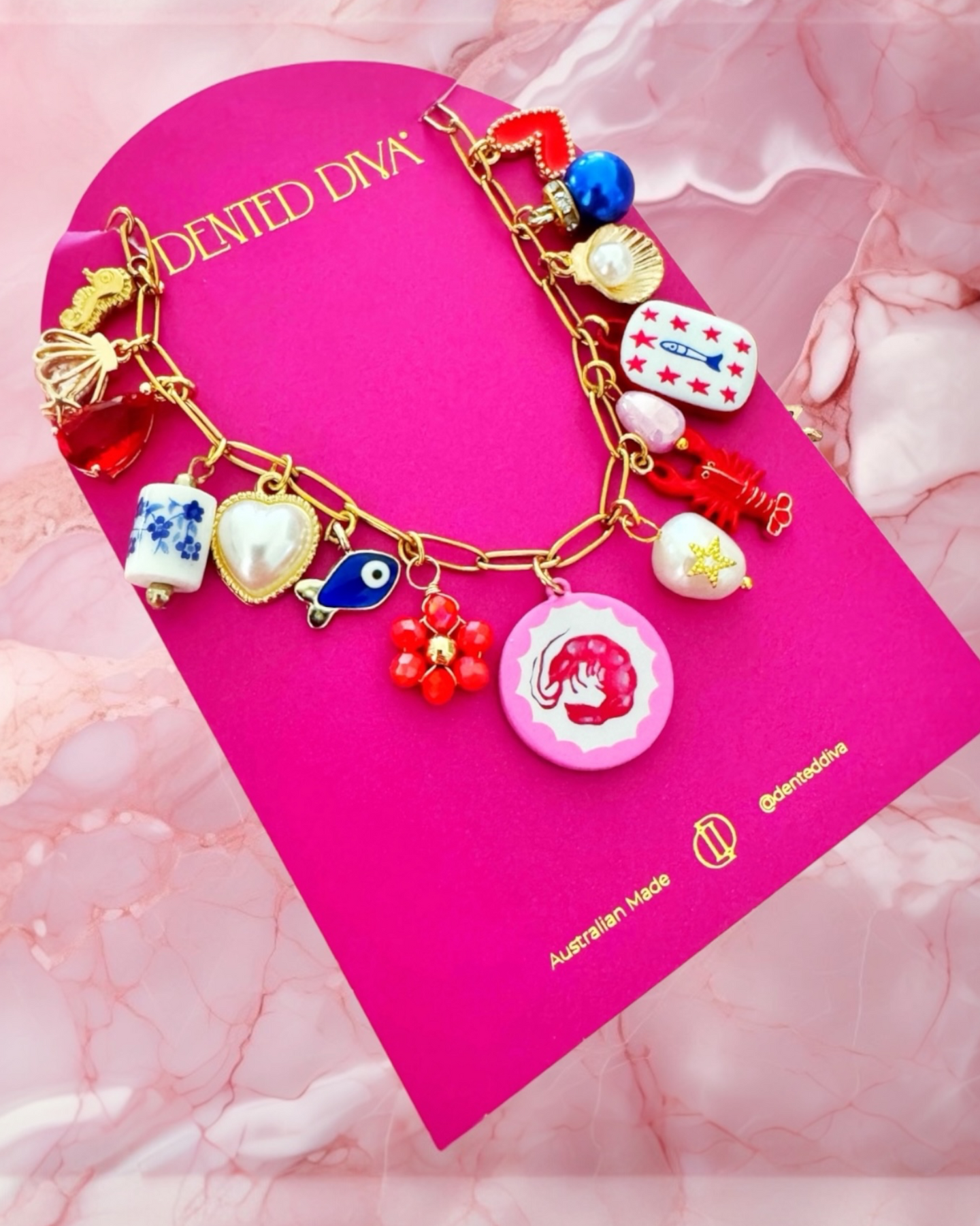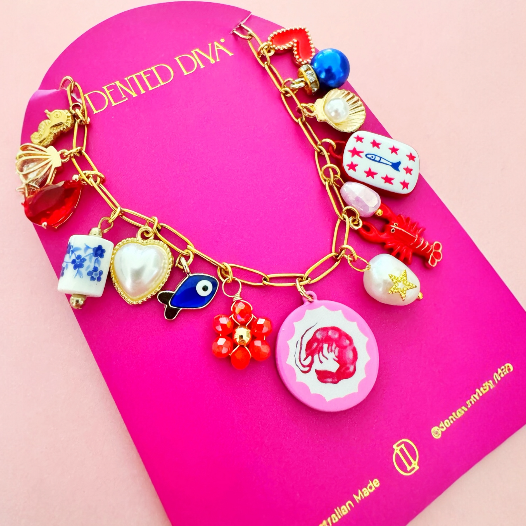 Each piece features hand-painted prawn charms, delicate painted tile charms, and carefully curated details selected by our creative director. The gold-toned design captures the enchantment of Amalfi and transforms a timeless accessory into a wearable story.